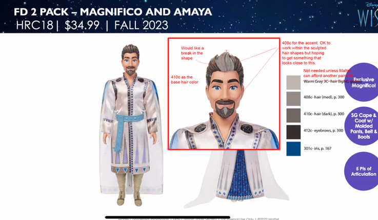 I had the opportunity to work on Disney Wish dolls and figures, including the Talking Valentino & Star Set, interactive electronic figure. My contributions spanned sculpting, face deco design, and integrating a magnetic sensor that triggers sound effects. I collaborated closely with Disney Studios to carefully select iconic phrases from the movie, ensuring the toy speaks over 10 sounds and English phrases inspired by the film. This process required balancing technical functionality with staying true to the movie's magical storytelling.
